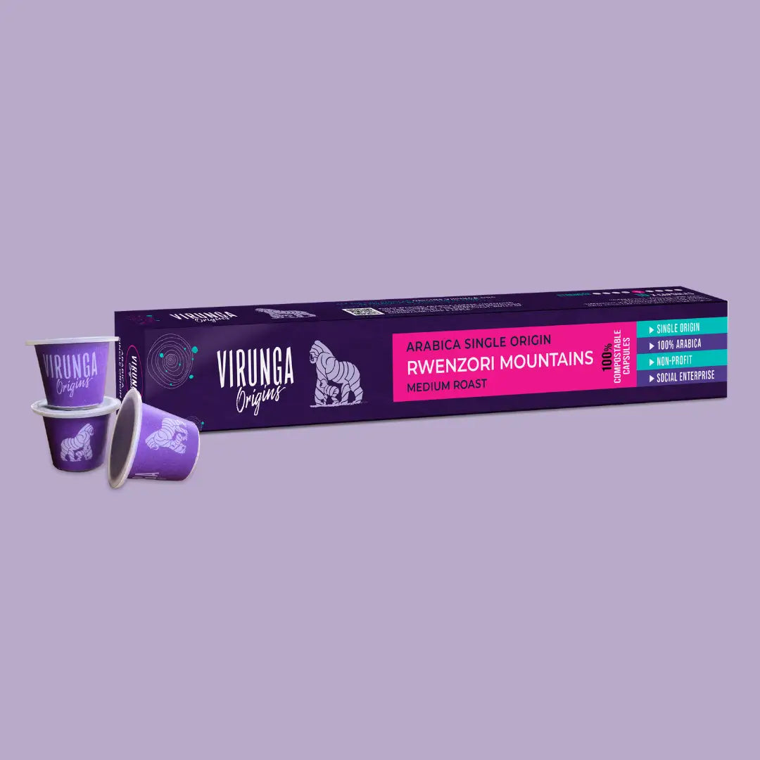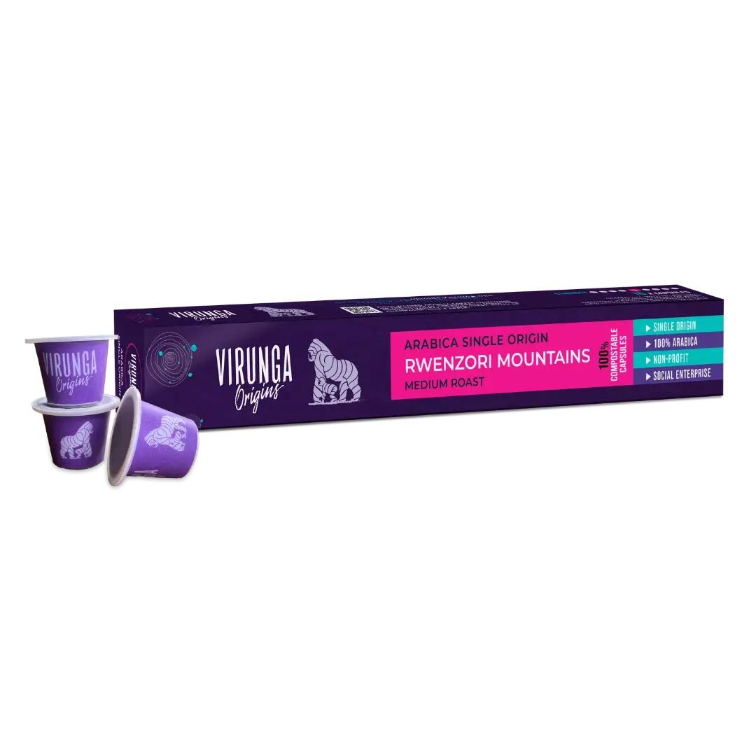 La commodité rencontre la qualité et la durabilité avec les capsules de café Virunga Origins – entièrement compostables et compatibles avec les machines Nespresso. Cultivés dans les sols volcaniques fertiles bordant le Parc National des Virunga, nos grains d'Arabica offrent une saveur légère et citronnée tout en créant un changement positif pour plus de 6,000 familles de cultivateurs de café autour du Parc. Chaque paquet contient 10 capsules.